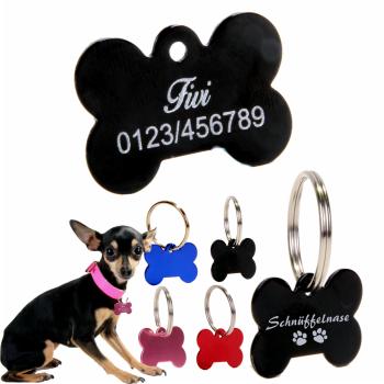 Die Hundemarke schwarz in Knochenform ist nicht nur schön, sondern auch praktisch. Die Hundeplaketten werden von uns mit einer brillanten und sehr hochwertigen Diamantgravur graviert. Als Grundlage für die Hundemarken in Knochenform, verwenden wir UV- und Witterungsbeständiges eloxiertes Aluminium. Wir Gravieren die Hundeplaketten in Knochenform nach deinen Wünschen und Vorgaben zum Beispiel mit den Namen des Hundes, deine Telefonnummer ☎ oder einem schönen Motiv. Hundetatzen und geschwungenen Herzchen ♥ werden immer gerne im Designer ausgewählt. Die Motive und Schriften sind frei skalierbar auf der Hundeplakette. Selbst die Größe von der Schrift und den Motiven kannst Du frei wählen oder an den Produkt selber anpassen.